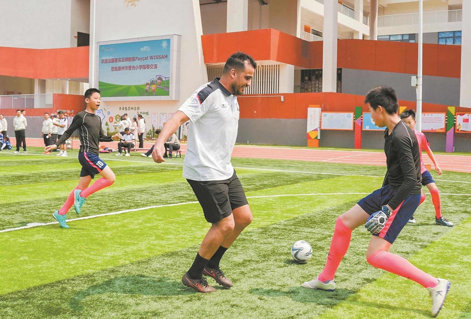 上个月,泉州市晋光小学迎来了法国著名足球教练Fayçal Wissam。他摒弃枯燥理论,以生动方式讲解带球、传球等基础动作,亲自示范要领。在训练后的友谊赛上,他下场与该校足球队进行切磋,实时讲解战术,教授攻防技巧。小球员们的精彩表现赢得了围观师生的喝彩。这场国际校园足球文化交流,不仅带来了先进的训练理念,更让孩子们拓宽视野,进一步感受足球魅力。