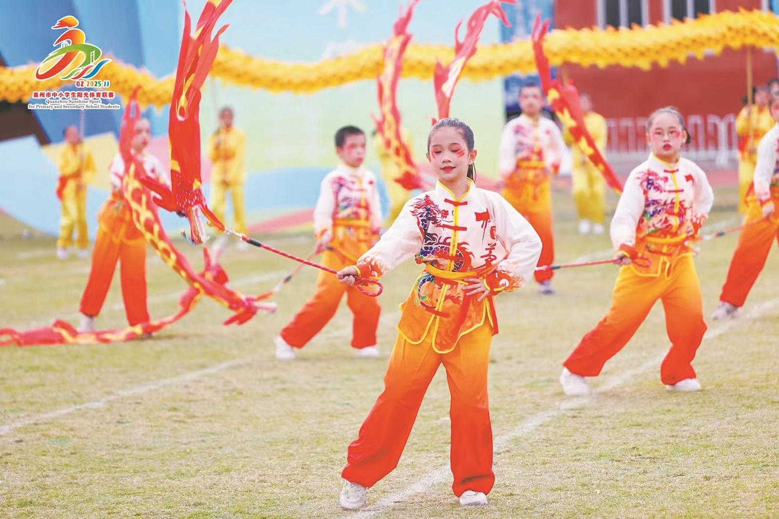 来自全市13个县(市、区)及市直学校的队伍,共带来14个特色展演节目,其中既有舞龙、永春白鹤拳、拍胸舞等传统体育项目的精彩演绎,也有花样跳绳、棒垒球、啦啦操等活力运动展示。据悉,永春县已实现白鹤拳操在全县校园的全覆盖,2025年当地学子还凭借该项目斩获全国武术赛事一等奖;德化县以“冰雪轮滑”为特色,跻身全国相关运动一体化试点区;台商投资区少年门球队曾获全运会群众比赛全国第四名,其棒垒球项目也已在校园广泛推广。